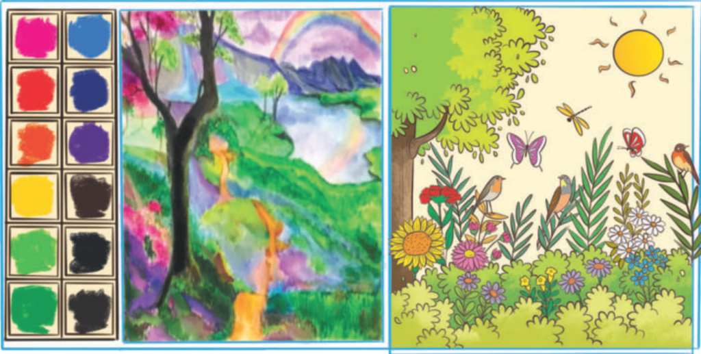 - Just as a garden has many colourful flowers and plants, similarly, a painting has many bright colours and designs.