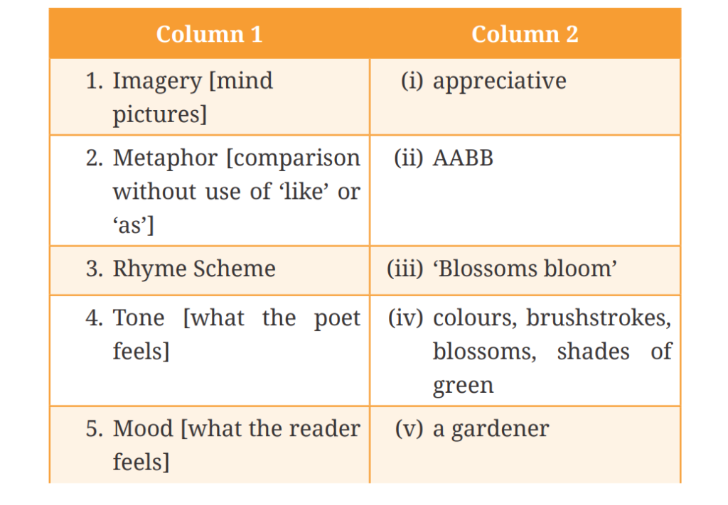 | 1. Imagery | (iv) colours, brushstrokes, blossoms, shades of green |