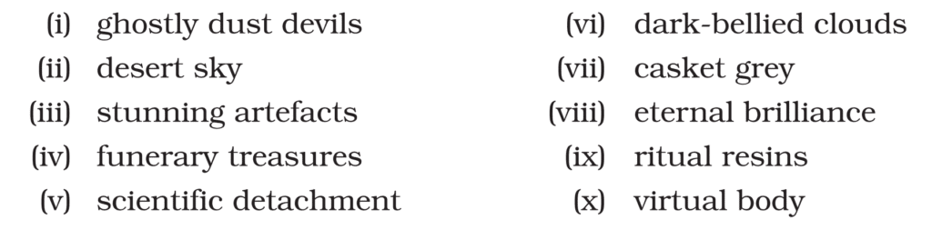 (i) ghostly dust devils: This term refers to the violent movement of dusty winds in a desert. The winds are called devils because they punish and annoy the workers for disturbing King Tut’s tomb.