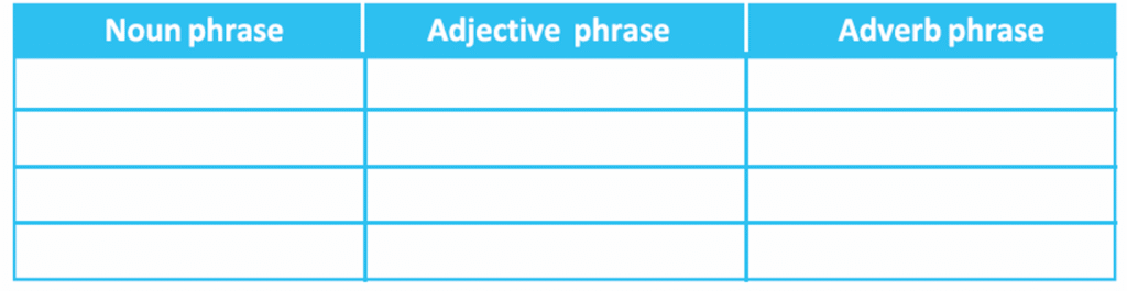 Read the following sentences. Identify the Noun phrases, Adjective phrases and Adverb phrases and fill in the chart given below:
