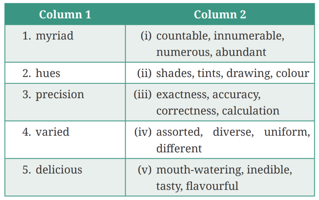 II. Identify the word from Column 2 that is not the synonym of the words given in Column 1.