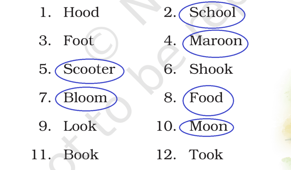 B. Say aloud the following words. Encircle the words which have a long ‘oo’ sound.