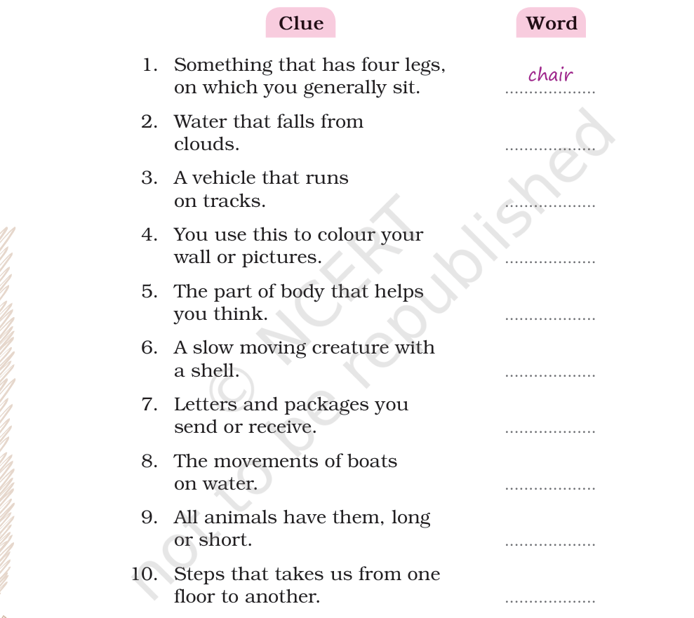 - C. You have already noticed that the word ‘scooter’ has ‘oo’ in the middle. Using the clues given below, write ten words that have ‘ai’ in the middle. One has been done for you?