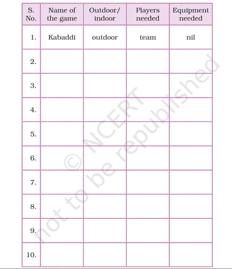 | S. No | Name of the game | Outdoor/ indoor | Players needed | Equipment needed |