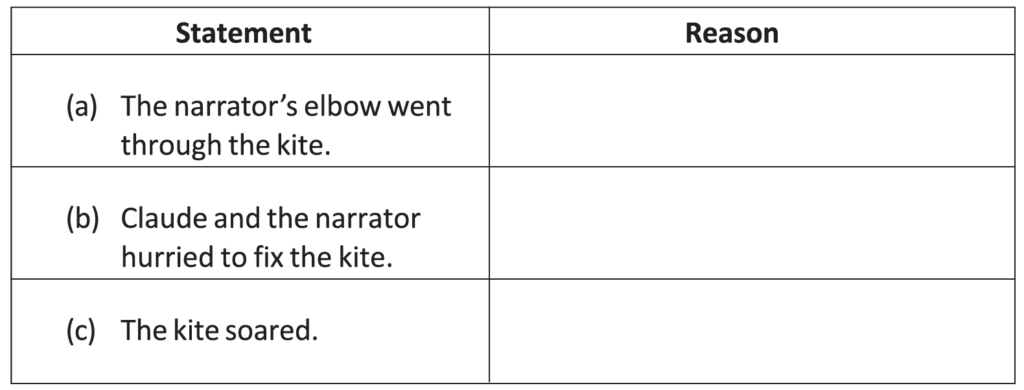 | (b) Claude and the narrator hurried to fix the kite. | They wanted to send it up before the wind fell. |