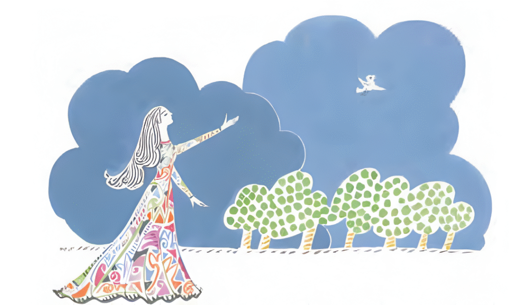 In the tale of Princess September, the protagonist is a very lonely princess who gradually accepts a tiny bird as her source of consolation. A very small bird enters while she is sobbing in her chamber and sings a lovely song narrating the king’s garden, the lake, and the willow trees. Thus, the princess’ mood lightens up and she requests the bird to be her companion. The bird agrees, sings different songs according to the day of the month, and becomes the special friend of September.