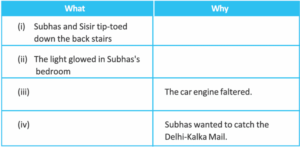 | (i) Subhas and Sisir tip-toed down the back stairs | So that they would not wake the family or alert the policemen keeping watch. |