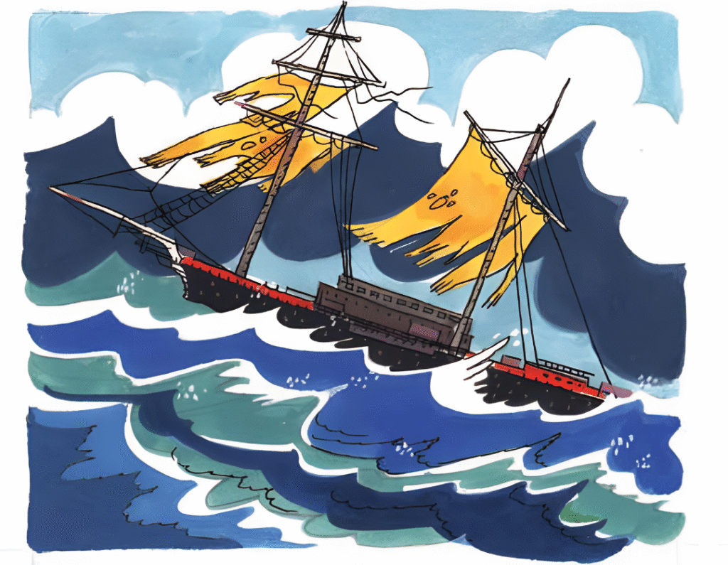 Ignoring his mother’s warning, Jon went to the sea and joined a ship. The wind cap proved very helpful as Jon could control the four winds by twisting the cap. He became valuable to the captain and was never allowed to go ashore. After spending more than a year at sea, Jon longed for land. One day, while he slept and dreamt about his farm, the cap twisted on its own and caused a terrible storm. The sailors blamed Jon. In anger, the captain twisted him by the cap and threw him into the sea. The moment Jon fell into the water, the cap slipped off his head, the storm stopped, and Jon safely swam ashore.
