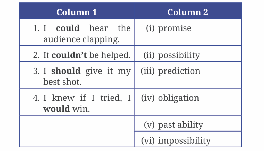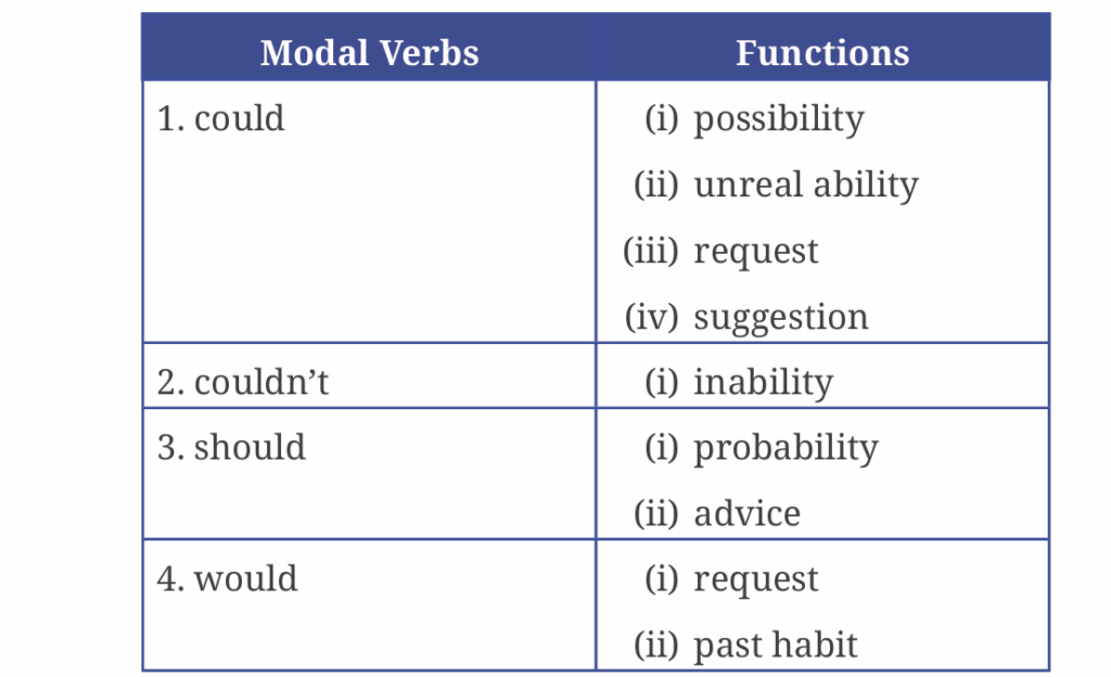 Now, make sentences with the modal verbs given in the table above with each function of the modal verbs. Mention the function in brackets.